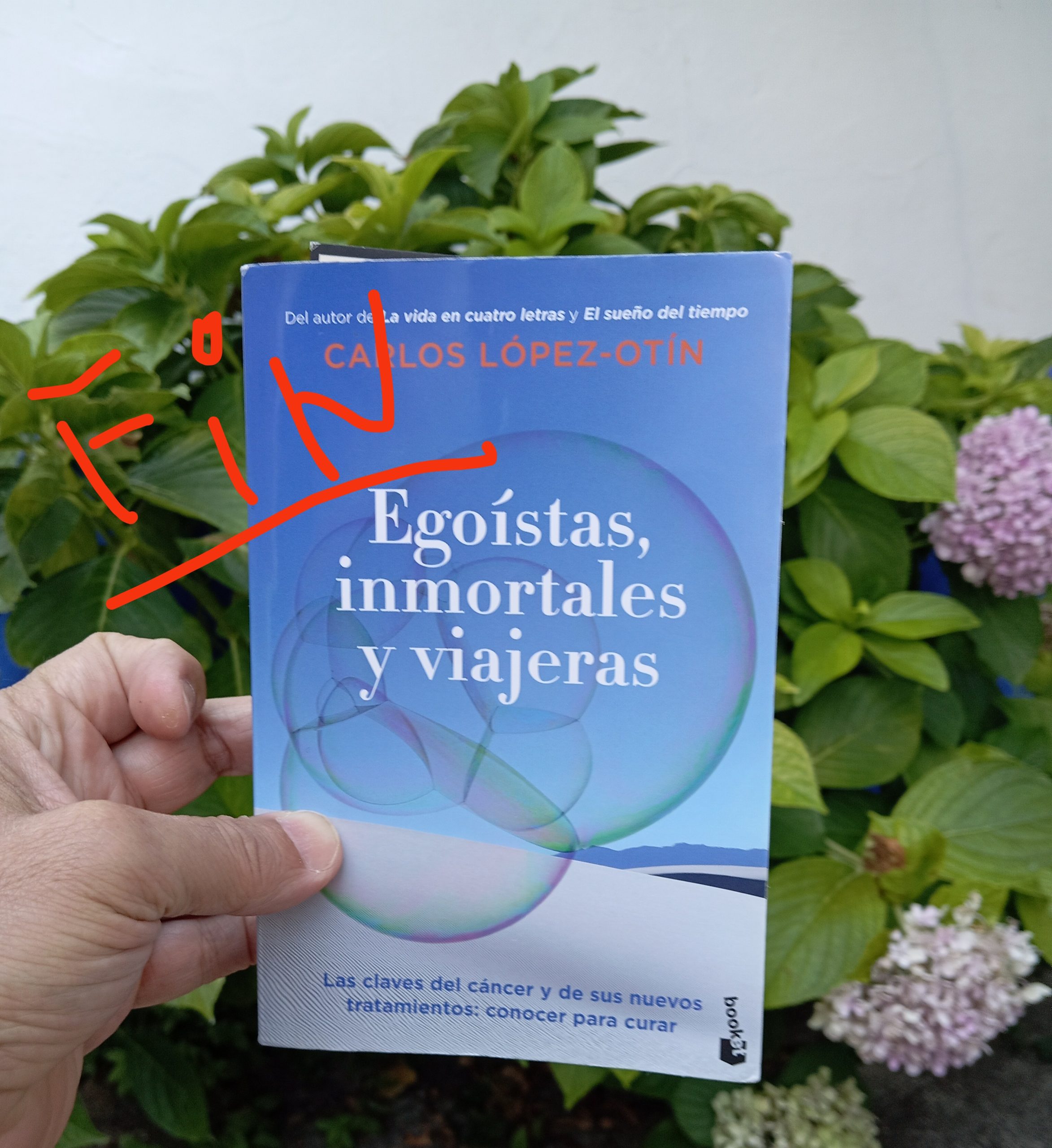 Al salir de la charla, compré “la anterior” de sus publicaciones: “Egoistas, inmortales y viajeras”, que puede ser más técnico; trataba del cáncer, su complejidad y sus vías de tratamiento. En la lectura se van descubriendo las causas del proceso y con ello la realidad de ciertas terapias más modernas y personalizadas.